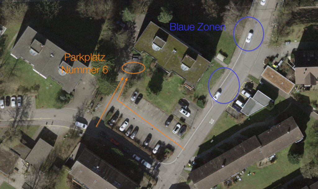 Blaue Zone vor dem Haus. Es kann auch Parkplatz Nummer 6 benutzt werden: